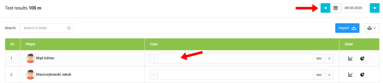 Para começar a preencher os resultados, você precisa clicar em "lista de testes" no menu à esquerda. Após clicar, você irá para a lista de testes. Lá você encontrará seus testes e alguns testes básicos preparados por nós. Estes incluirão uma corrida de 5m, corrida de 20m, corrida de 30m e teste de beep. Após clicar em um determinado teste, você verá uma lista de jogadores participando do teste. Se não houver testes no dia atual, você verá campos vazios com espaço para inserir os resultados do teste. Para alterar a data do teste, clique no campo de data no canto superior direito da janela.