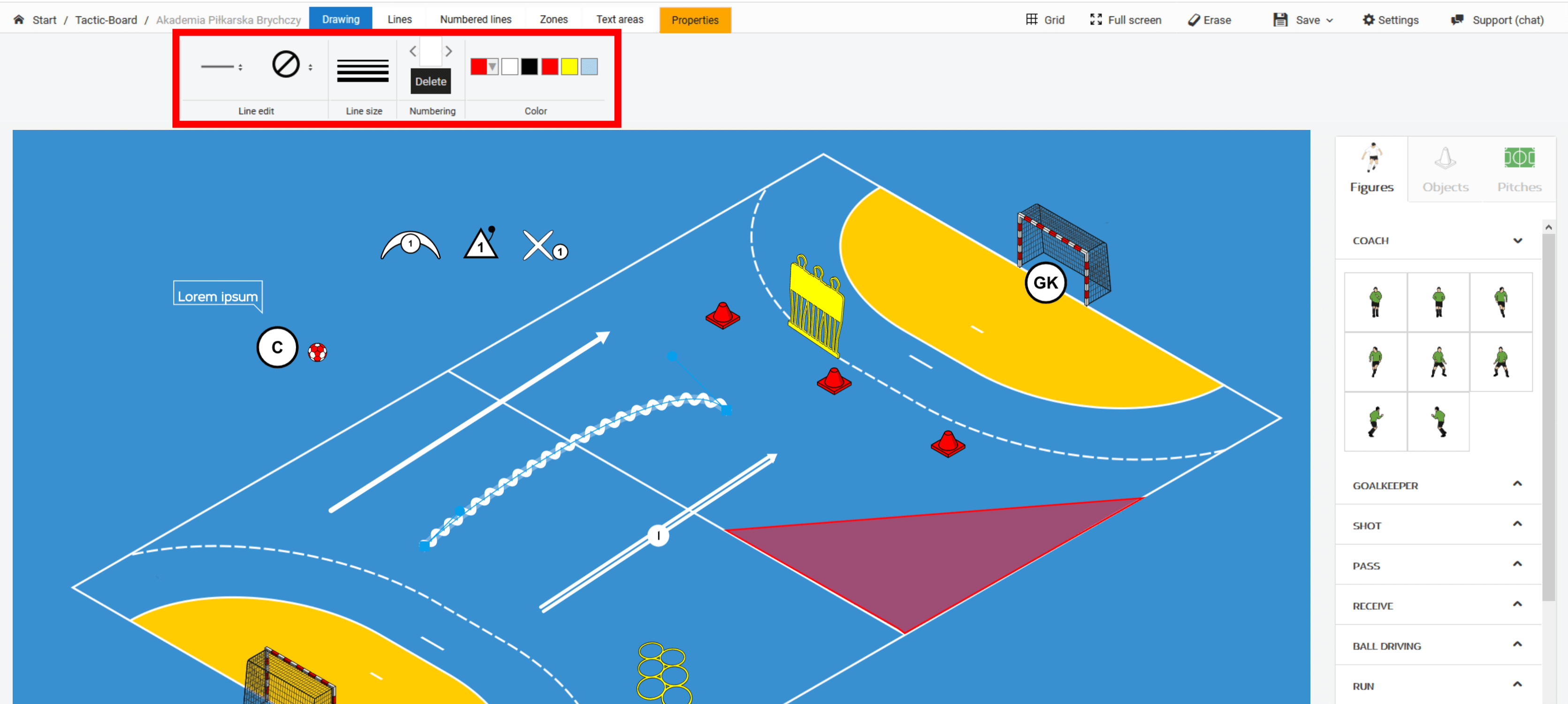 Proces risanja zahteva zgornjo škatlo z orodjem in desni meni. Desni meni je odgovoren za dodajo elementov na igrišče. Tukaj imate izbiro elementov kot so igrišča, igralci in oprema. Vsak od njih je prenesen na igrišče z izbiro in označevanjem mesta na igrišču kjer bi se moral prikazati. Zgornja orodna vrstica je namenjena izbiri črt, con in območij teksta. Po izbiri predmeta lahko kliknete nanj, da se bodo prikazale njegove lastnosti. Da predmet izbrišete, kliknete na njega z desnim gumbom in izberite možnost izbrisa v vsebinskem meniju. Druga možnost je klik na gumb delete na vaši tipkovnici.
