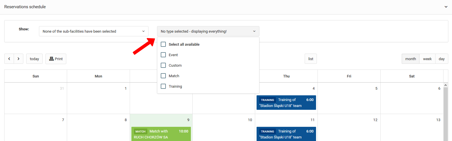 V predogledu vsake podstavbe na dnu strani je urnik za rezervacijo dane podstavbe. Nad koledarjem imate možnost, da filtrirate specifično lokacijo in specifično vrsto dogodka, da se zviša berljivost koledarja v primeru visoke zasedenosti.